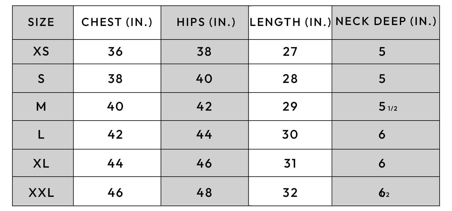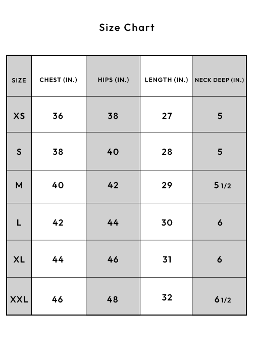 - High GSM Round neck ribbed fabric for the neckline to not lose shape & form.
